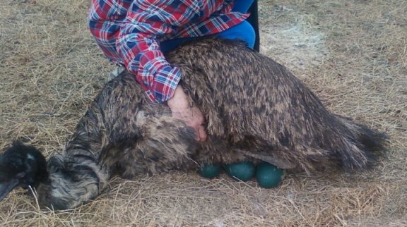 Emu roosters hatch eggs and raise chicks, not hens. Unlike the ostrich, the more docile emu can be handled while sitting on eggs (pictured below).