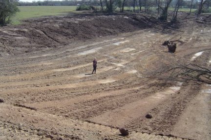 Sherriee Magness is standing in the bottom of the lake during construction. The emu pens are in the background at upper left. The trees laying in the bottom are for fish structure.
