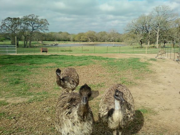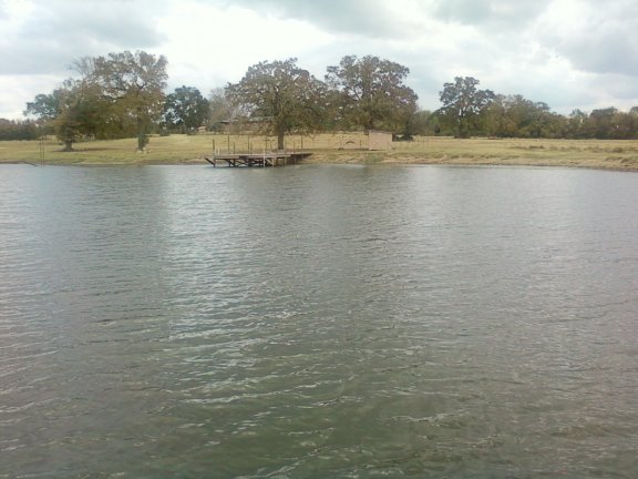Here, you are shown the lake house, pier, and emus in the background. You can also see the water level is much lower than the picture above. The water level constantly varies by several feet depending on rain, weather, etc.