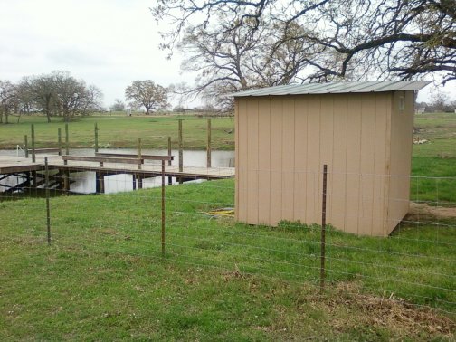 You can just see the small 8' x 8' building (lake-house) that houses the well pump and tanks to the right of the pier.